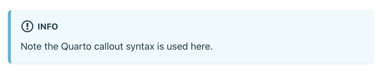 Like Quarto, Docusaurus includes support for Callouts and Tabsets. When including these components in a document, you should use the Quarto standard markdown syntax, which will be automatically translated to the appropriate Docusaurus constructs.